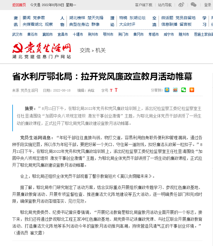 “年轻干部往往直接与钱、物打交道,容易利用自身职务便利和管理漏洞,通过各种手段实施犯罪,所以作为年轻干部,要把好第一个关口、守住第一道防线,扣好廉洁从政第一粒扣子。”8月11日下午,在鄂北局2022年党务和党风廉政培训班上,派出纪检监察工委纪检监察室主任杜显清围绕“加固中央八项规定堤坝 激发干事创业激情”主题,为鄂北局全体党员干部讲授了一场生动的廉政课程,正式拉开了鄂北局党风廉政建设宣教月活动帷幕。