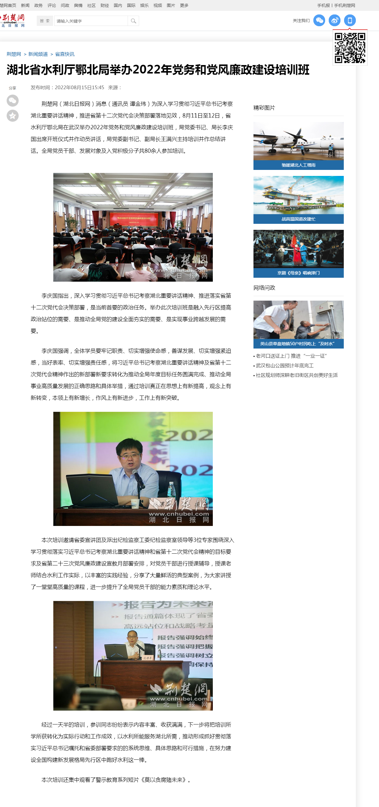 为深入学习贯彻习近平总书记考察湖北重要讲话精神,推进省第十二次党代会决策部署落地见效,8月11日至12日,省水利厅鄂北局在武汉举办2022年党务和党风廉政建设培训班,局党委书记、局长李庆国出席开班仪式并作动员讲话,局党委副书记、副局长王满兴主持培训并作总结讲话。全局党员干部、发展对象及入党积极分子共80余人参加培训。