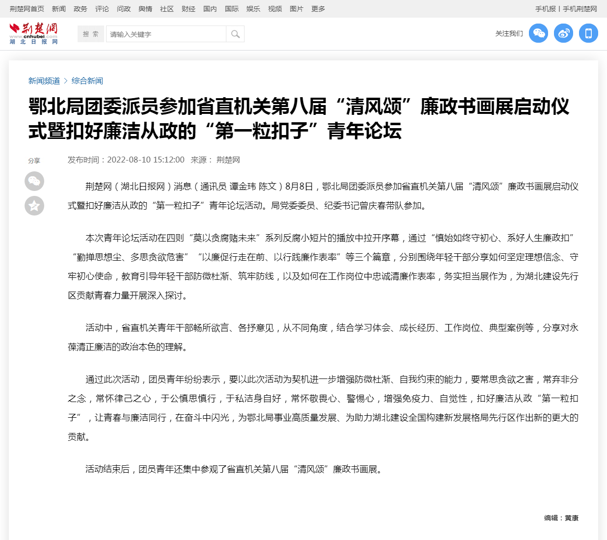 8月8日,鄂北局团委派员参加省直机关第八届“清风颂”廉政书画展启动仪式暨扣好廉洁从政的“第一粒扣子”青年论坛活动。局党委委员、纪委书记曾庆春带队参加。