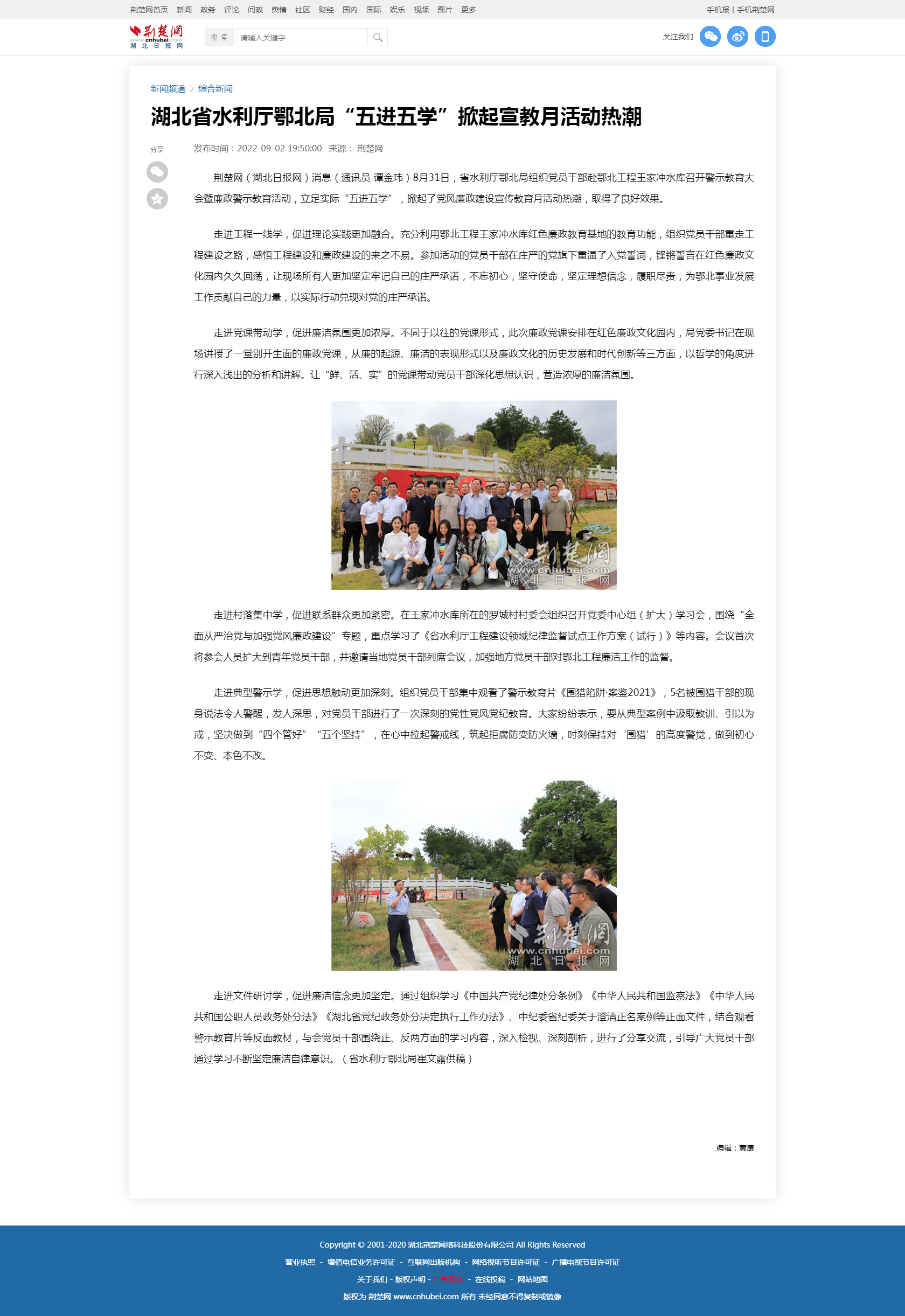 8月31日,省水利厅鄂北局组织党员干部赴鄂北工程王家冲水库召开警示教育大会暨廉政警示教育活动,立足实际“五进五学”,掀起了党风廉政建设宣传教育月活动热潮,取得了良好效果。