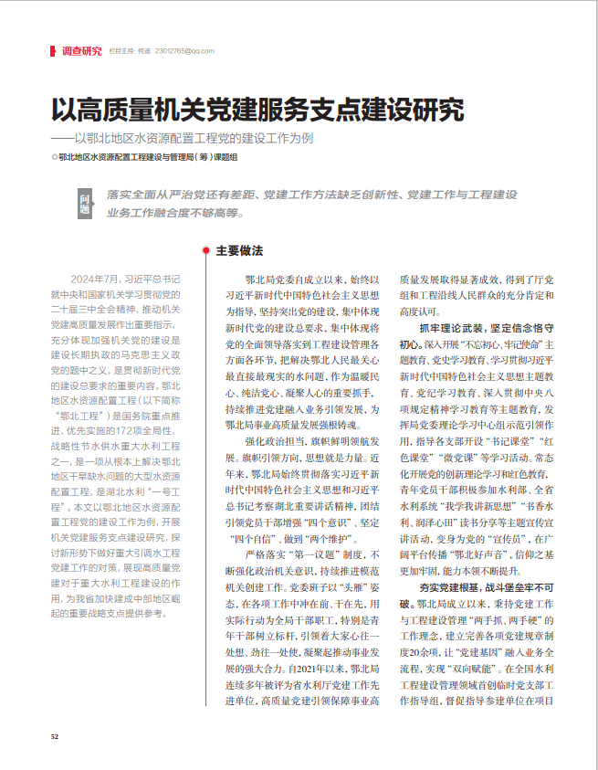 2024年7月,习近平总书记就中央和国家机关学习贯彻党的二十届三中全会精神、推动机关党建高质量发展作出重要指示,充分体现加强机关党的建设是建设长期执政的马克思主义政党的题中之义,是贯彻新时代党的建设总要求的重要内容。鄂北地区水资源配置工程(以下简称“鄂北工程”)为国务院重点推进、优先实施的172项全局性、战略性节水供水重大水利工程之一,是一项从根本上解决鄂北地区干旱缺水问题的大型水资源配置工程,是湖北水利“一号工程”。本文以鄂北地区水资源配置工程党的建设工作为例,开展机关党建服务建成支点研究,探讨新形势下做好重大引调水工程党建工作的对策,展现高质量党建对于重大水利工程建设的作用,为我省加快建成中部地区崛起的重要战略支点提供参考。