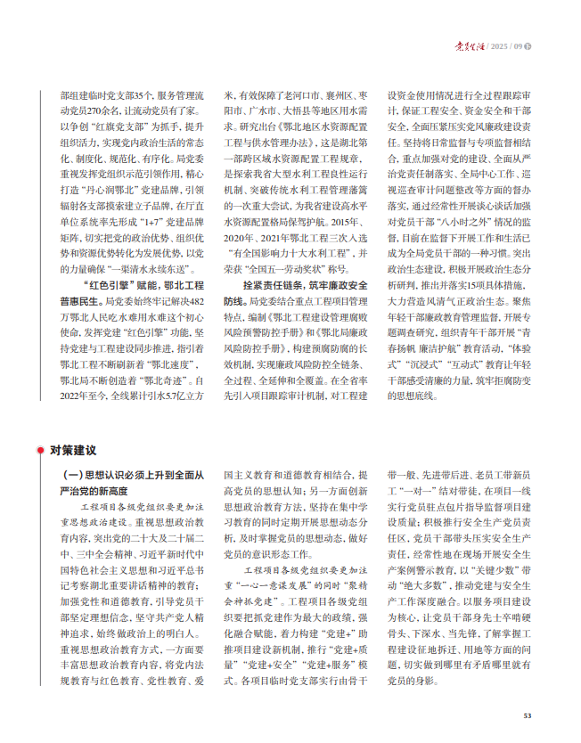 工程项目各级党组织要更加注重思想政治建设。重视思想政治教育内容,突出党的二十大及二十届二中三中全会精神、习近平新时代中国特色社会主义思想和习近平总书记考察湖北重要指示批示精神的教育;加强党性和道德教育,引导党员干部坚定理想信念,坚守共产党人精神追求,始终做政治上的明白人。重视思想政治教育方式,一方面要丰富思想政治教育内容,将党内法规教育与红色教育、党性教育、爱国主义教育和道德教育相结合,提高党员的思想认知;另一方面创新思想政治教育的方法,坚持集中学习教育的同时定期开展思想动态分析,及时分析掌握党员的思想动态,做好党员的意识形态工作。