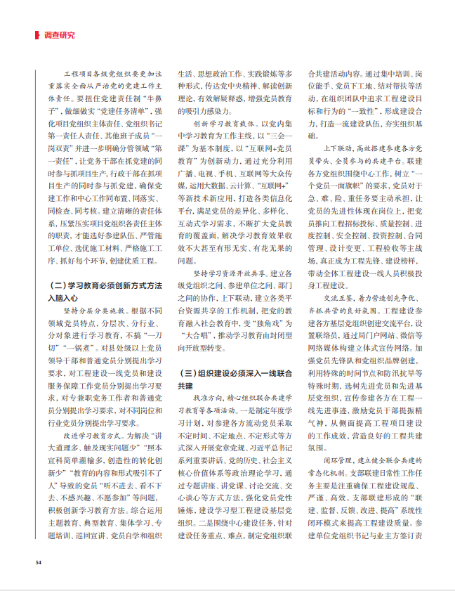工程项目各级党组织要更加注重“一心一意谋发展”的同时“聚精会神抓党建”。工程项目各级党组织要把抓党建作为最大的政绩,强化融合赋能,着力构建“党建+”助推项目建设新机制推行“党建+质量”“党建+安全”“党建+服务”模式。各项目临时党支部实行由骨干带一般、先进带后进、老员工带新员工“一对一”结对带徒,在项目一线实行党员驻点包片指导监督项目建设质量;积极推行安全生产党员责任区,党员干部带头压实安全生产责任,经常性现场开展安全生产案例警示教育,以“关键少数”带动“绝大多数”,推动党建与安全生产工作深度融合。以服务项目建设为核心,让党员身先士卒啃硬骨头、下深水、当先锋,了解掌握工程建设征地拆迁、用地等方面的问题,切实做到哪里有矛盾哪里就有党员的身影。
