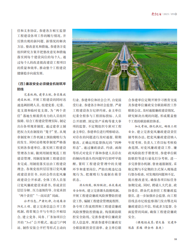 加大考核,强化执纪,确保工程安全。建立完善党风廉政建设责任制考核办法,把党风廉政建设纳入年度考核、负责人工作目标考核检查范围,对党风廉政建设工作、廉政风险防控手册使用、参建单位联防联控等进行量化打分考核。进一步完善督办机制、督查通报制度,采取定期与不定期的方式深入现场进行督办检查,对发现的问题和不足,提出整改意见,确保各项目标任务如期完成。同时,聘请人大代表、政协委员、群众代表担任工程廉政监督员,进一步加强社会监督。向工程沿线县市纪检监察部门发出鄂北局廉政建设公开信,形成多方监督、全面监管的局面,确保工程建设廉政安全。 (鄂北地区水资源配置工程建设与管理局(筹)课题组,课题组成员:曾庆春 宋建华 陈鼎 崔璨 谭金玮 秦爽)