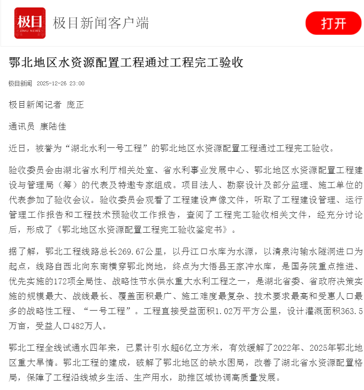 鄂北工程全线试通水四年来,已累计引水超6亿立方米,有效缓解了2022年、2025年鄂北地区重大旱情。鄂北工程的建成,破解了鄂北地区的缺水困局,改善了湖北省水资源配置格局,保障了工程沿线城乡生活、生产用水,助推区域协调高质量发展。