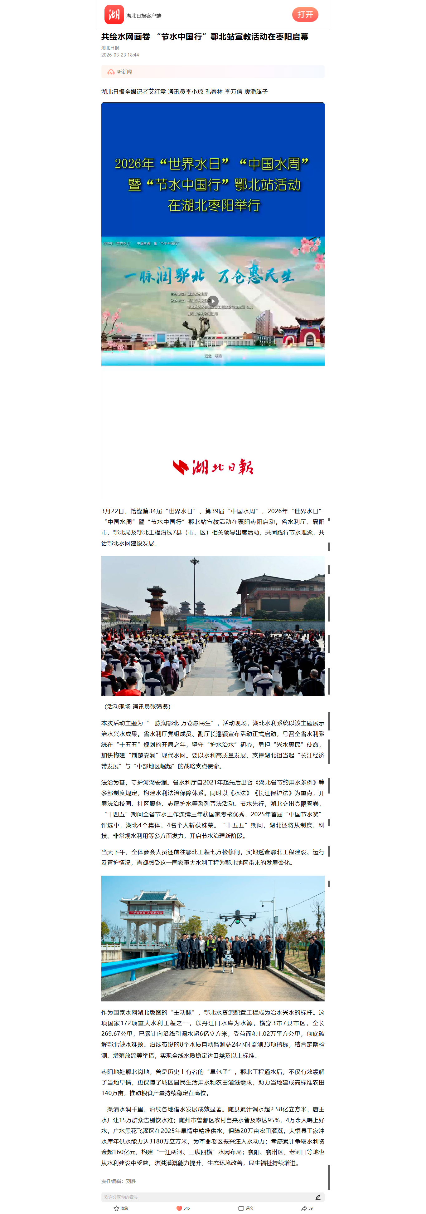 一渠清水润千里,沿线各地借水发展成效显著。随县累计调水超2.58亿立方米,唐王水厂让15万群众告别饮水难;随州市曾都区农村自来水普及率达95%,4万余人喝上好水;广水黑花飞灌区在2025年旱情中精准供水,保障20万亩农田灌溉;大悟县王家冲水库年供水能力达3180万立方米,为革命老区振兴注入水动力;孝感累计争取水利资金超160亿元,构建“一江两河、三纵四横”水网布局;襄阳、襄州区、老河口等地也从水利建设中受益,防洪灌溉能力提升,生态环境改善,民生福祉持续增进。