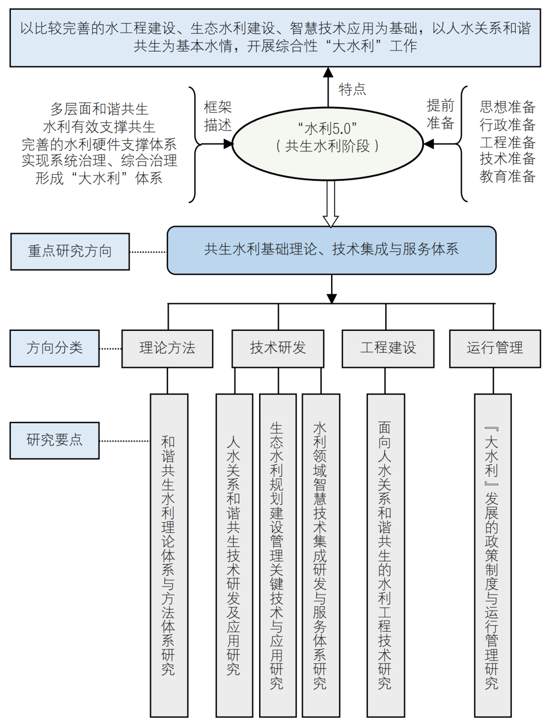 从21世纪初开始,就为“水利5.0”做了前期准备。2001年开始使用“人水和谐”一词,2004年“中国水周”活动的主题为“人水和谐”,这时已经把人水和谐思想引进到治水实践中。2005年国家提出“构建和谐社会”的部署,“人水和谐”成为当时治水工作的核心内容。大约从2005年起我国学者开始了人水和谐理论与实践研究工作,取得了一系列理论和应用研究成果,直到目前我国治水始终坚持人水和谐思想。2017年10月,党的十九大报告提出:“坚持人与自然和谐共生”。人水和谐是人与自然和谐共生的重要组成部分,人水和谐论研究成果也为人与自然和谐共生思想的形成奠定了基础。从该角度看,多年前就开始了共生水利的前期准备,至少从2001年起,“水利2.0”(资源水利阶段)和“水利3.0”(生态水利阶段)都已把人水和谐、人与自然和谐共生作为治水的重要指导思想。即使到2021年进入以“智慧水利”为主的“水利4.0”,也同样有大量的人水和谐、人与自然和谐共生的讨论、研究、技术准备等工作。2035年之前是“水利5.0”的准备阶段,预计到2036年起进入共生水利阶段。下图展示了“水利5.0”的框架和重点研究方向,笔者对这一阶段的轮廓框架描述如下。
