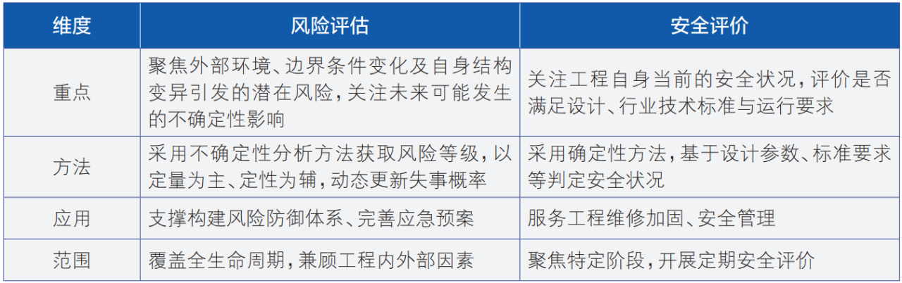 需要注意的是,风险评估与安全评价在目标与方法上存在显著差异。风险评估聚焦外部环境、边界条件变化以及自身结构变异引发的潜在不确定性风险,采用不确定性分析方法量化风险等级,服务于风险防御体系构建与应急预案完善,覆盖工程全生命周期并兼顾内外部因素;安全评价则关注工程自身当前状态是否满足现行国家和行业技术标准,采用确定性方法判定安全状况,服务于工程维修加固与安全管理。