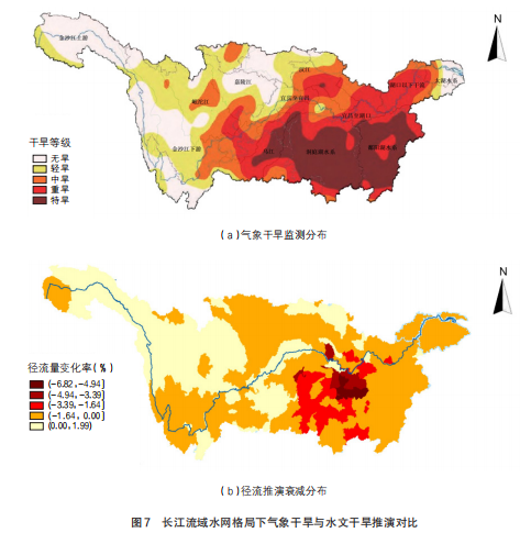 针对长江流域,开展1596座大中型水库、12项流域水网大型调水工程、260个地市经济与生态单元的水网水资源供需态势推演,对2022年长江流域大旱场景进行了模拟。分析发现,长江中下游流域整体表现为气象特大干旱,但径流衰减明显的区域为洞庭湖、清江、汉江和鄱阳湖水系,比气象干旱范围小很多,河川关键断面仍保持一定径流量,这与2022年长江特大干旱期间断面径流监测数据分布一致(见图7)。这表明城市供水安全实现了大幅提升,水网调蓄结点和连通工程对于抵御大范围干旱具有显著作用。