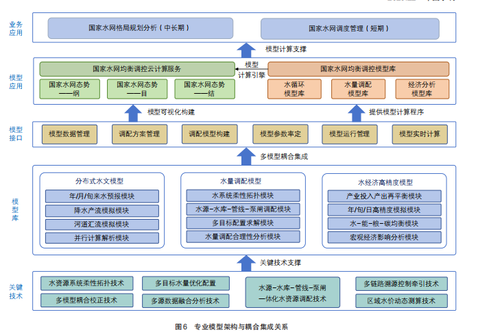 针对水网格局下江河流域总量控制、年度计划制定、实时及应急调度为核心的管理需求,全面考虑水网水资源从源头获取到最终去向的全过程,研发相关的专业模型。这些模型旨在有效支撑江河流域水量分配、大型跨流域调水工程计划调度以及日常与应急调度方案编制。根据不同应用场景的实际需求,需灵活进行模型的组合与联动,每类模型可以由多个子模型构成,形成集合预报体系,最终实现对相关业务领域的全面支撑,确保水网调配的科学性和高效性。相关模型架构与耦合集成关系见图6。
