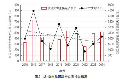 从洪涝灾害损失情况看,与上一个10年(2005—2014年)相比,近10年(2015—2024年)全国因洪涝灾害死亡失踪人口数量级下降到百人量级,且近10年内呈显著降低趋势,因洪涝灾害直接年经济损失维持在千亿元,且近10年呈缓慢下降趋势(见图2)。