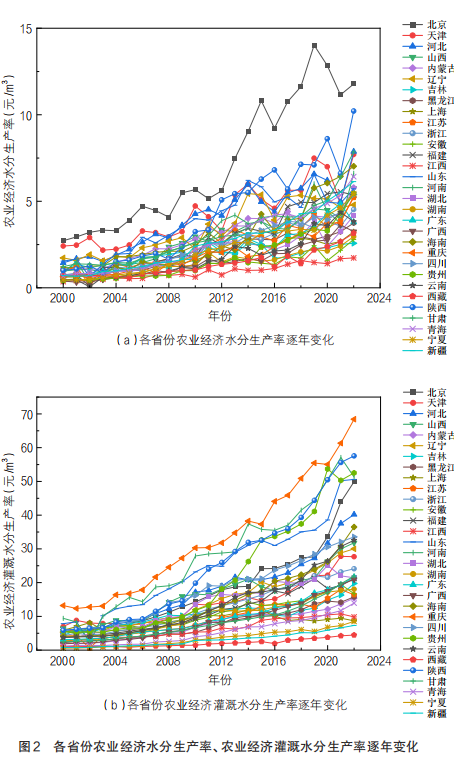 综上,本研究是在前人研究成果基础上,将不同作物产量转化为产值,从经济角度构建不同区域的农业经济水分生产率和农业经济灌溉水分生产率,进而分析2000—2022年二者在我国各省份的时空变化特征,探讨其主要影响因素,揭示我国农业水资源配置的经济效率规律。研究结果可为提高农业用水效率、制定分区分类节水政策和促进农业可持续发展提供理论支撑。