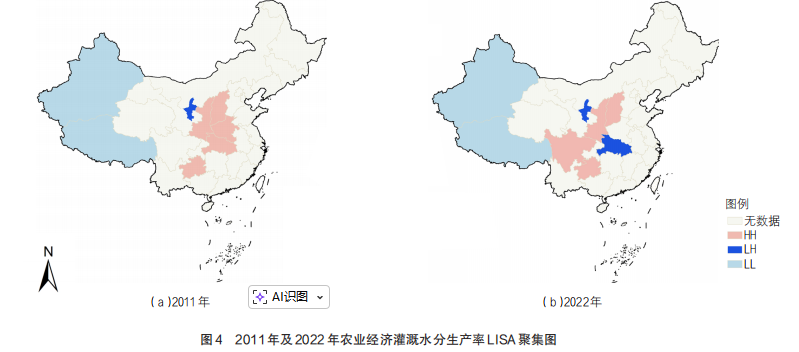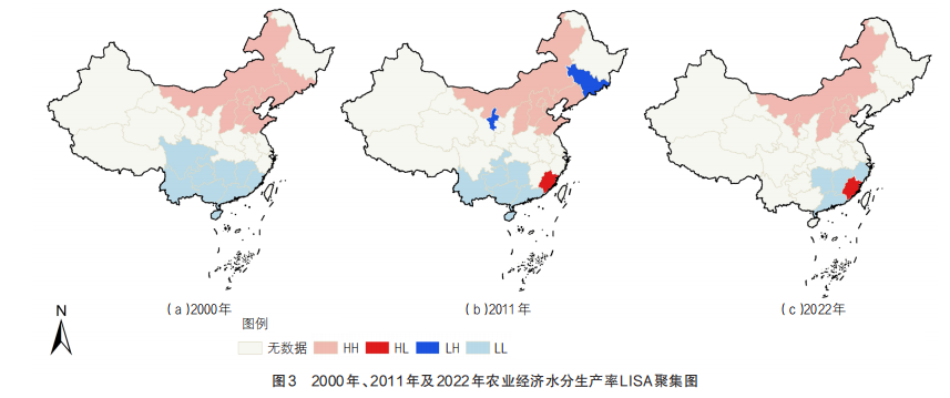 空间自相关包含全局和局部两种形式,用于衡量空间内某种属性的聚集程度。全局空间自相关旨在分析解释特定地理现象或属性在整个区域内的空间特性,通过计算Moran’sI指数和进行Z检验判断是否存在聚集倾向。本研究中,局部空间自相关可通过量化省域单元农业经济水分生产率的空间异质性,识别聚集区的空间区位、分布范围与变化趋势,最终通过空间关联局域指标(LISA)聚集图予以呈现;将省域结果和全国平均水平对比分析,明确各省份农业经济水分生产率在全国的相对水平。将LISA聚集图中的属性归纳为4类:“高-高(HH)”型,即某省份及其周边省份农业经济水分生产率均较高;“低-高(LH)”型,说明某省份农业经济水分生产率低但周边省份高;“高-低(HL)”型,指某省份该值高但周边省份低;“低-低(LL)”型,反映某省份与周边省份该值均较低。其中,“高-高(HH)”型和“低-低(LL)”型反映各省份属性值之间存在显著的空间正相关,呈现出一定的均质性;“高-低(HL)”型和“低-高(LH)”型则呈现出较强的空间负相关性,表明各省份之间具有异质性。当设定显著性水平时,能够对各区域局部空间自相关属性的显著性做出判断。借助ArcGIS软件实现对各省份地区的局部相关性分析。本研究选取起始年(2000年)、中间年(2011年)和末尾年(2022年)为代表年,揭示我国全国及各省份农业经济水分生产率的时空演变特征。