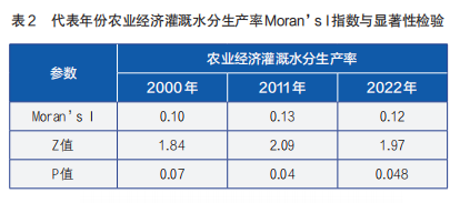 表2显示,三个代表年份的农业经济灌溉水分生产率全局Moran’sI指数均为正值,其中仅2000年(初始年)的统计检验结果为不显著(P>0.05),2011与2022年均达到显著水平(P<0.05)。这表明研究时段内各省份间存在着正自相关关系,虽然随着时间发展逐渐表现出一定的空间聚集,但整体空间聚集不显著。