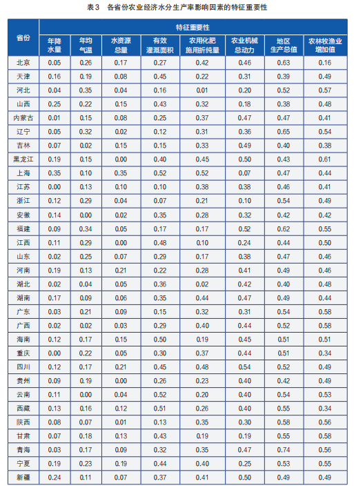 为评估各影响特征对模型的贡献及对农业经济水分生产率的作用,采用随机森林特征重要性评价方法。随机森林在2001年被Breiman提出,通过构建多棵决策树并集成其预测结果,可有效降低过拟合风险,自动捕捉特征间的交互作用。与传统方法相比,其在评价特征重要性时既考虑了单一特征影响,又反映了特征组合的综合贡献。该模型通过自助法重采样技术抽取约75%样本为训练集,其余作为袋外数据用于验证。本研究基于袋外数据特征重要性评价方法,通过随机排列输入特征值,依据袋外数据上模型的性能变化,估算各特征的贡献及重要性。该方法优势显著,能为研究提供全面可靠的结果。特征重要性值一般大于0,值越大则贡献越大,反之越小或无贡献。特征重要性值计算分析在MATLABR2020a和Excel软件中完成。