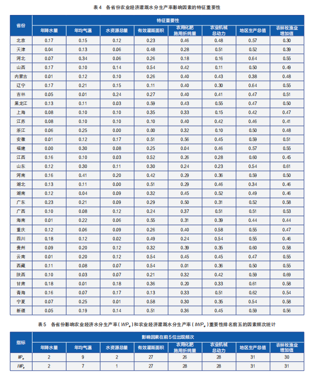 为进一步明确不同影响因素对农业经济水分生产率和农业经济灌溉水分生产率的影响程度,本研究对各省份特征重要性排序前五的要素开展了频次统计,结果见表5。研究发现农业经济水分生产率影响因素排名前5频次由高到低依次是地区生产总值>农林牧渔业增加值>农业机械总动力>有效灌溉面积>农用化肥施用折纯量>年均气温>年降水量=水资源总量;农业经济灌溉水分生产率的是地区生产总值=农林牧渔业增加值>农业机械总动力=农用化肥施用折纯量>有效灌溉面积>年均气温>年降水量>水资源总量。说明大部分地区影响水分生产率指标的主要因素是地区生产总值、农林牧渔业增加值、农业机械总动力、有效灌溉面积和农用化肥施用折纯量等经济要素和农机技术要素。