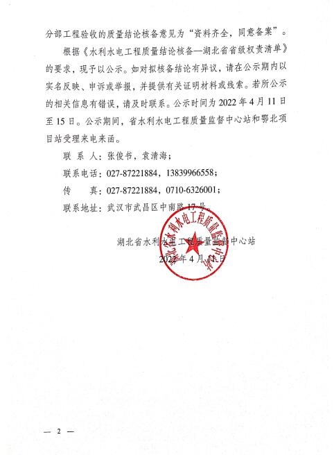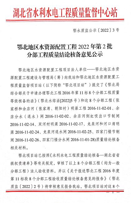 鄂北地区水资源配置工程2022年第2批分部工程质量结论核备意见公示(鄂水质监公示[2022]3号)