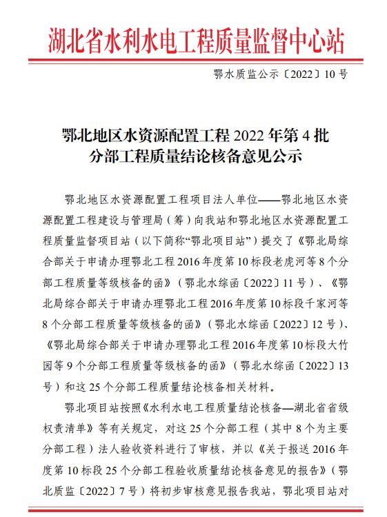 鄂北地区水资源配置工程2022年第4批分部工程质量结论核备意见公示(鄂水质监公示[2022]10号))
