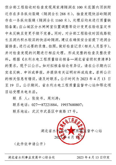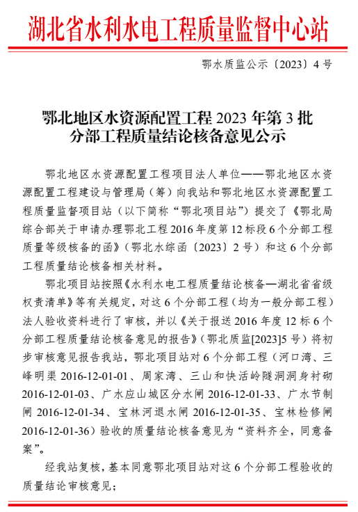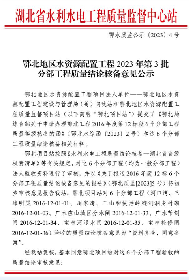 鄂北地区水资源配置工程2023年第3批分部工程质量结论核备意见公示