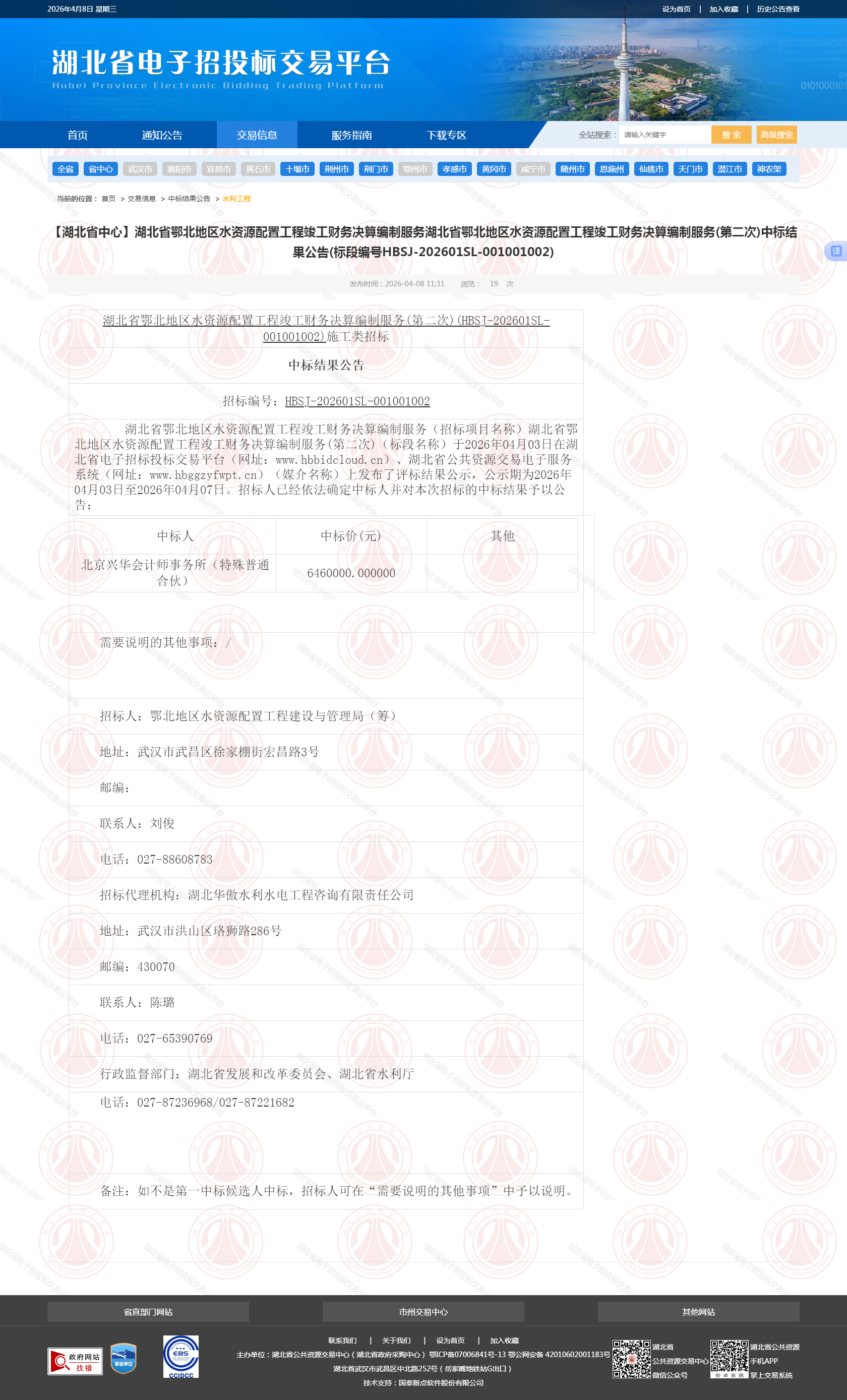 湖北省鄂北地区水资源配置工程竣工财务决算编制服务(第二次)中标结果公告