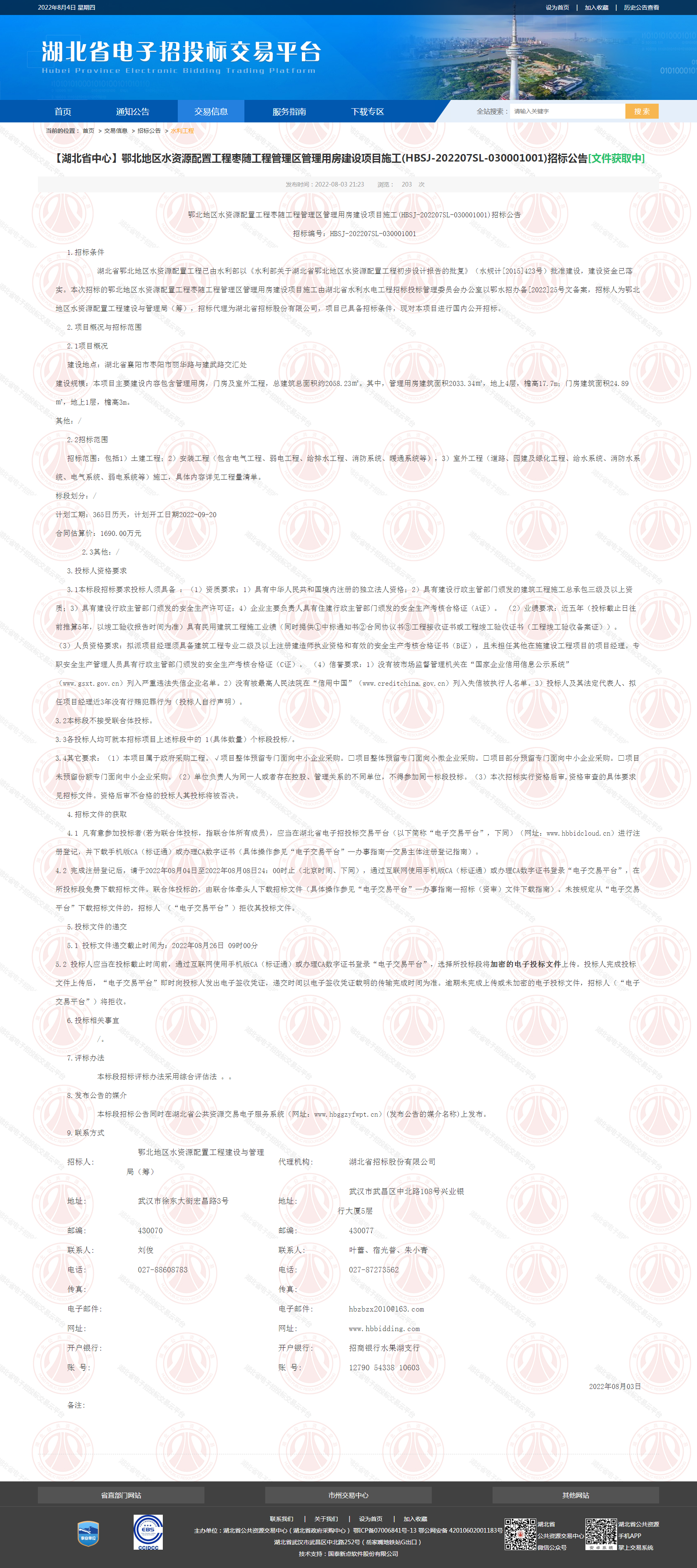 鄂北地区水资源配置工程枣随工程管理区管理用房建设项目施工(HBSJ-202207SL-030001001)招标公告
